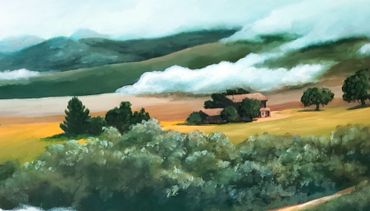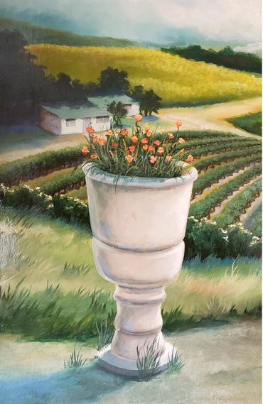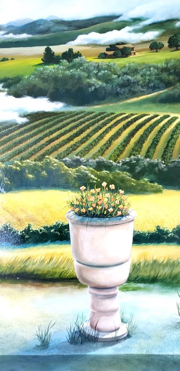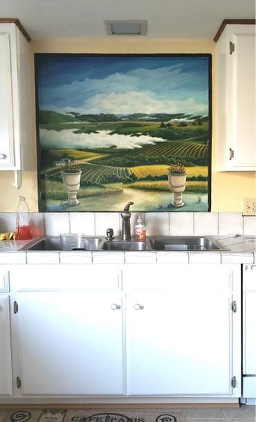 I painted this mural scene depicting the surrounding landscape of the Santa Maria Valley, California. Including Oak and Pine trees, rural roads, local farms, foot hills and of coarse avocado orchards and grape vineyards. Its panted above the kitchen sink.
