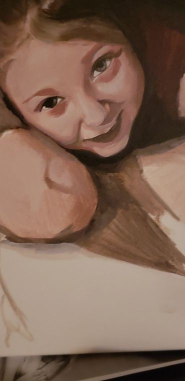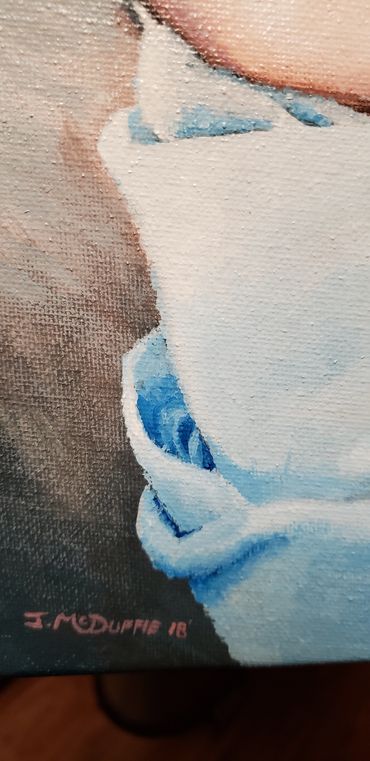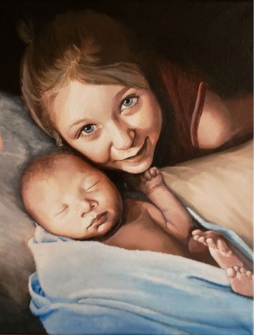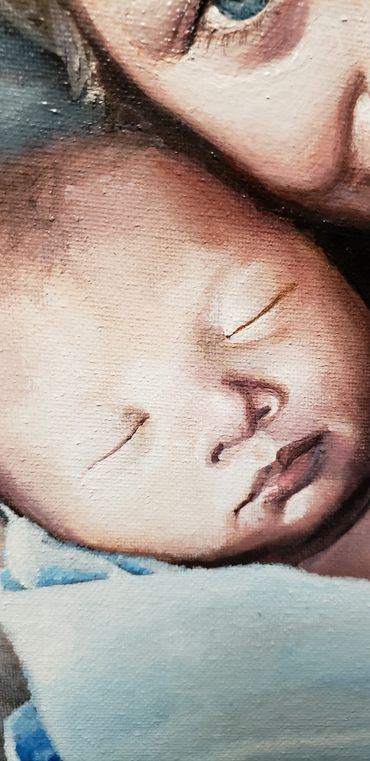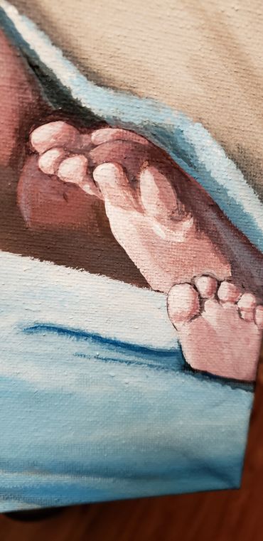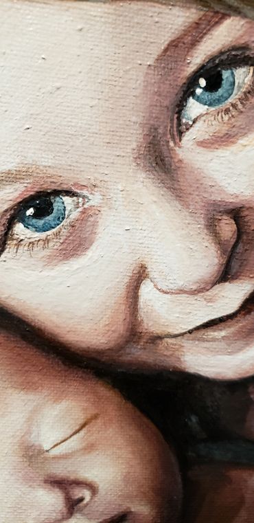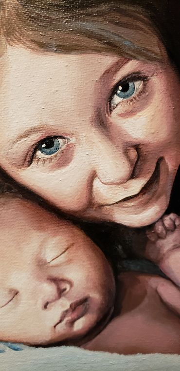 This is a 12" x 16" acrylic painting using professional artist grade paint on stretched canvas. Painted from a cell phone picture sent to me by my client. I started by laying out the composition, where the two children will be placed. Cropping out any unneeded background. This was a fun painting because of all the different textures to paint. The faces use soft shading, their hair is smooth and shiny and the baby blanket is soft and puffy as you can see in the images below.