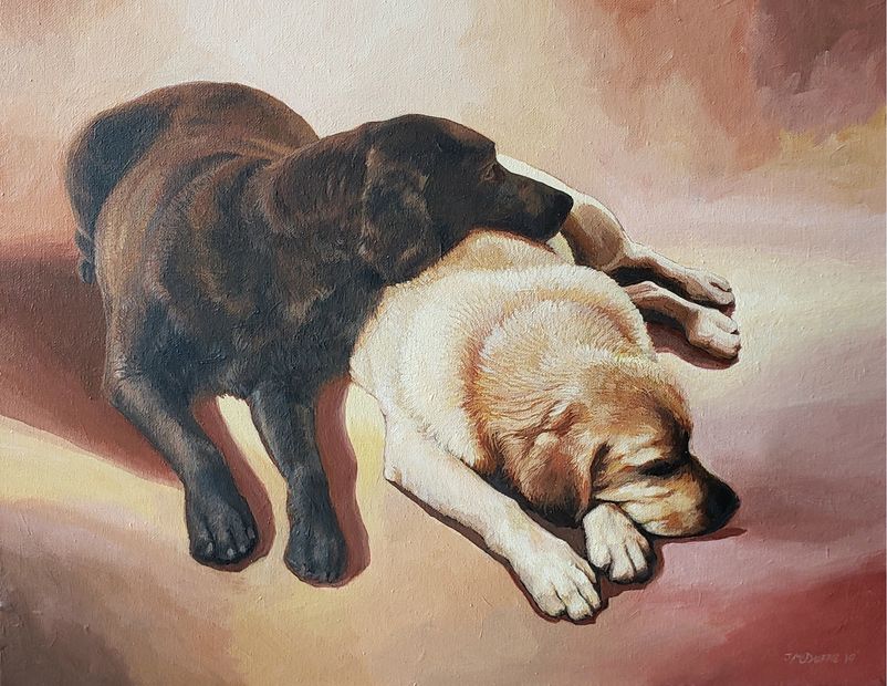 Here is an acrylic painting of two dogs, best buddies just relaxing with each other.